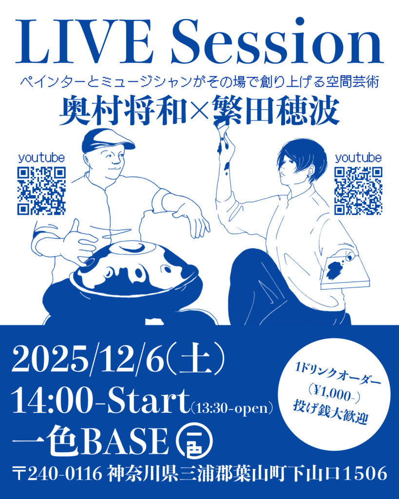 一色BASE”にて、ペインター繁田穂波と、ミュージシャン奥村将和によるライブペイント × 即興演奏 のアートセッションを開催します。